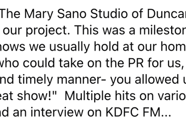 "Our historic nonprofit arts organization, San Francisco Women Artists (SFWA), was very pleased with the public relations work done by Chase Roberts to help increase the visibility of our SFWA Gallery located in the Inner Sunset. She is very personable, engaging and energetic, paying close attention to detail, planning for the future and providing feedback. Chase is well connected to the San Francisco community and promoted our Gallery and events to a wide range of media, podcasts and news outlets. We are grateful for the extra time she spent on promotions that were beneficial to SFWA."